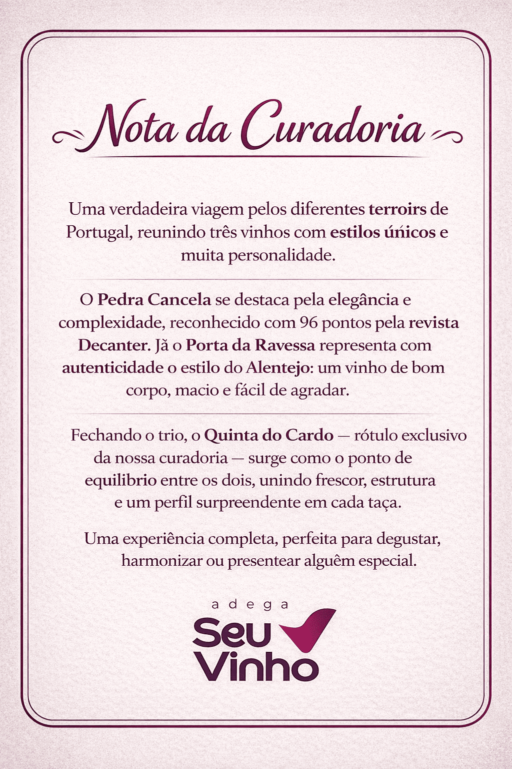 Este kit reúne 03 vinhos de regiões diferentes de Portugal — Alentejo, Dão e Beira Interior — oferecendo uma experiência completa, didática e extremamente prazerosa, seja para degustação pessoal ou para presentear com sofisticação.